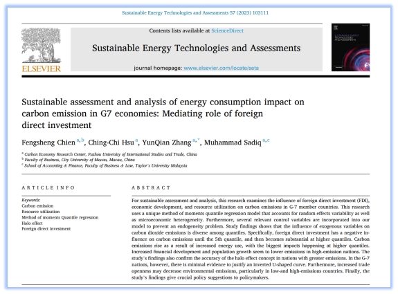 中文标题:七国集团(G7)经济体能源消耗对碳排放影响的可持续性评估与分析:外国直接投资的中介作用