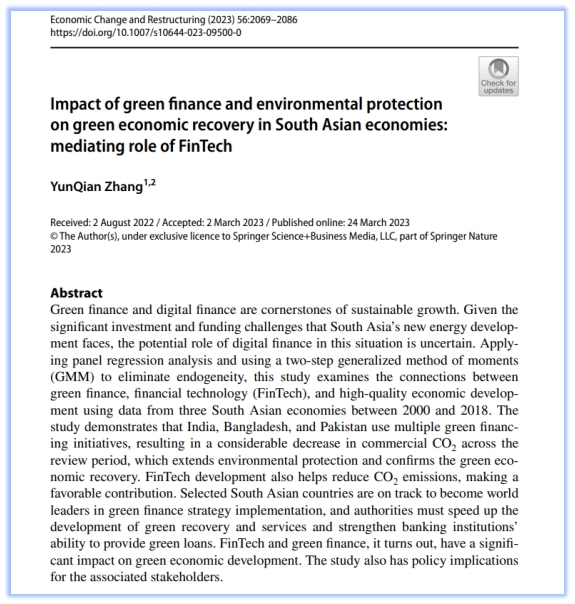 中文标题:绿色金融与环境保护对南亚经济体绿色经济复苏的影响——金融科技的中介作用