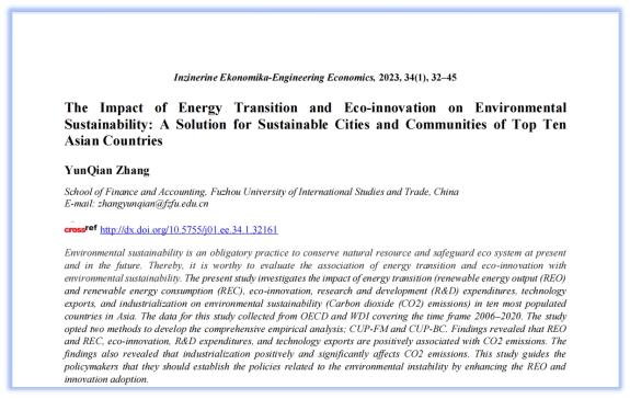摘要:环境可持续性是当前及未来保护自然资源、维护生态系统的必要举措。因此,评估能源转型、生态创新与环境可持续性之间的关联具有重要意义。本研究探讨了能源转型(可再生能源产出(REO)和可再生能源消费(REC))、生态创新、研发支出、技术出口及工业化对亚洲十大人口大国环境可持续性(二氧化碳排放)的影响。研究数据来源于经合组织(OECD)和世界发展指标(WDI),时间跨度为2006-2020年。本研究采用CUP-FM和CUP-BC两种方法开展综合实证分析,结果显示:可再生能源产出、可再生能源消费、生态创新、研发支出及技术出口与二氧化碳排放呈负相关;工业化对二氧化碳排放具有显著正向影响。本研究为政策制定者提供参考,建议通过增加可再生能源产出和推广创新应用,制定应对环境不稳定的相关政策。