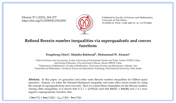 摘要:本文对希尔伯特空间算子的若干Berezin数不等式进行了推广与改进。具体而言,我们利用超二次函数性与凸函数性的概念,对Hermite-Hadamard不等式及近期其他相关结果作了精细化改进,进而将这些不等式推广至Berezin数情形。在所得不等式中特别指出:若S,T∈L(H(Ω))满足ber(T)≤ber(|S|),且f为非负超二次函数,则有